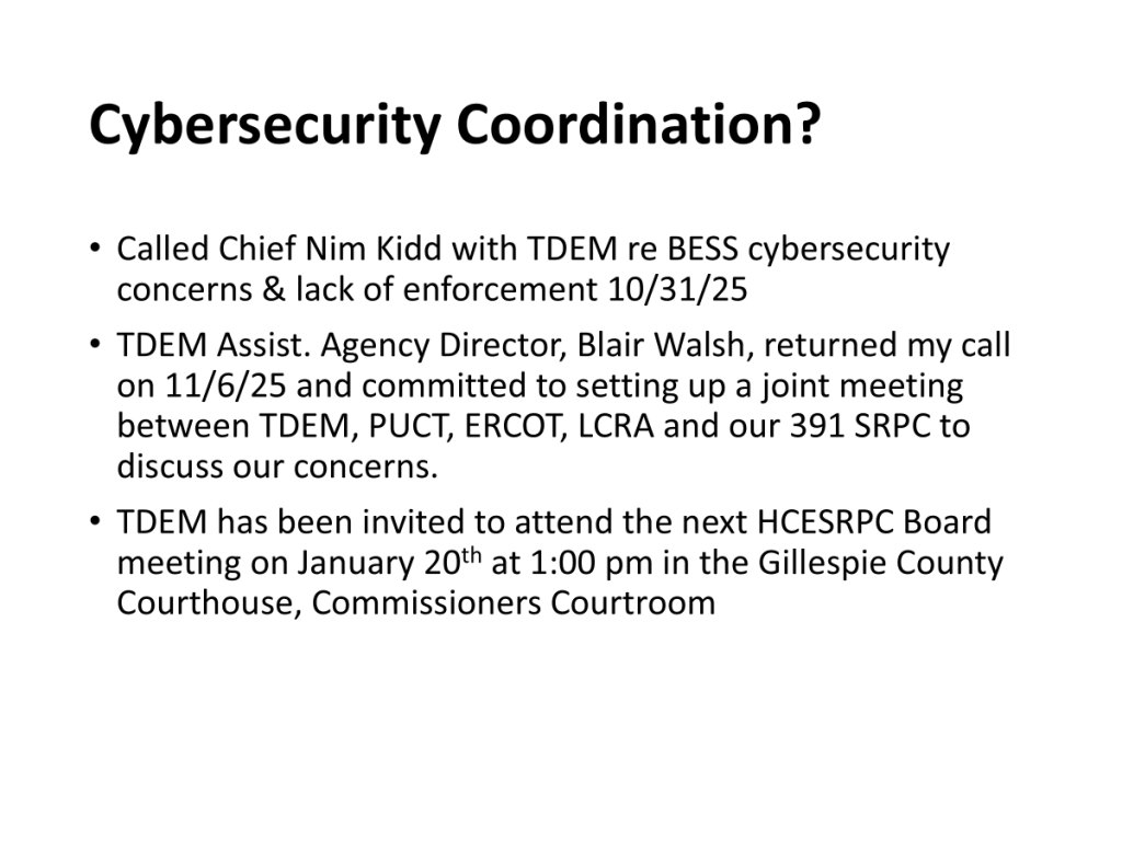 The following was presented during the Kerr County Commissioners’ Court workshop on BESS that took place on January 5th. The workshop discussion is also available on YouTube via the Kerr County Commissioners’ Court website.